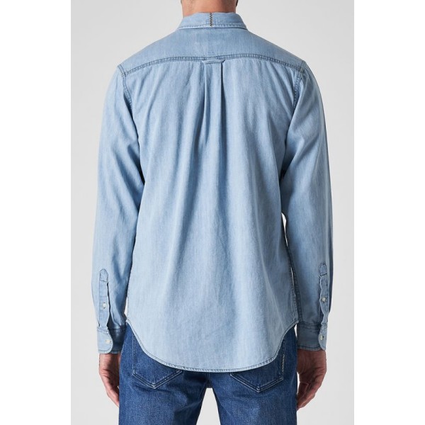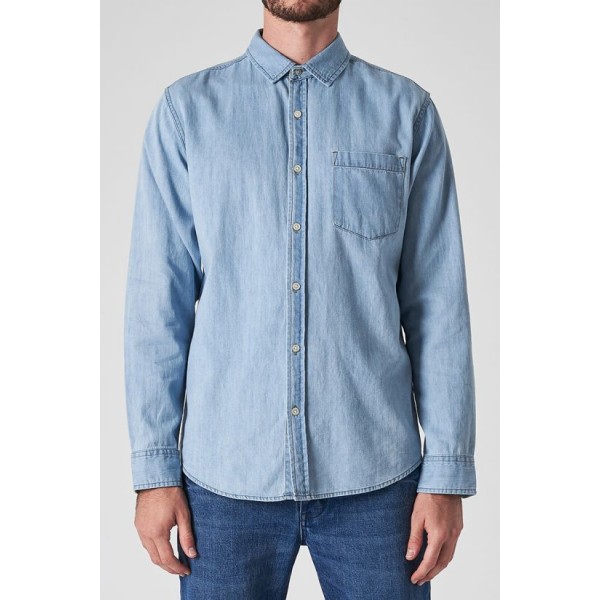 Our Waits long sleeve shirt is a versatile staple for every guy's wardrobe. We've crafted it from super lightweight 6.5OZ cotton denim and washed it to achieve the perfect light blue tone. It features a classic collared neckline, long sleeves and is finished with mother of pearl buttons at the front and embroidery detail on the back collar. This style can be worn on its own tucked into denim for a directional look or layered over a coloured tee to emulate this season's contemporary feel.