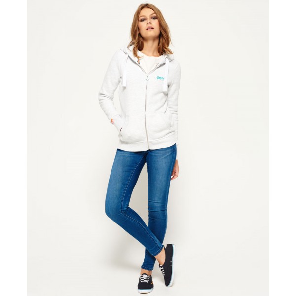 Superdry women's Primary zip hoodie from the Orange Label range. A classic zip up hoodie featuring an embroidered Superdry logo on the chest, drawstring hood and two front pockets. The hoodie is finished with a Superdry logo tab on the cuff and the signature orange stitching on the side seam.