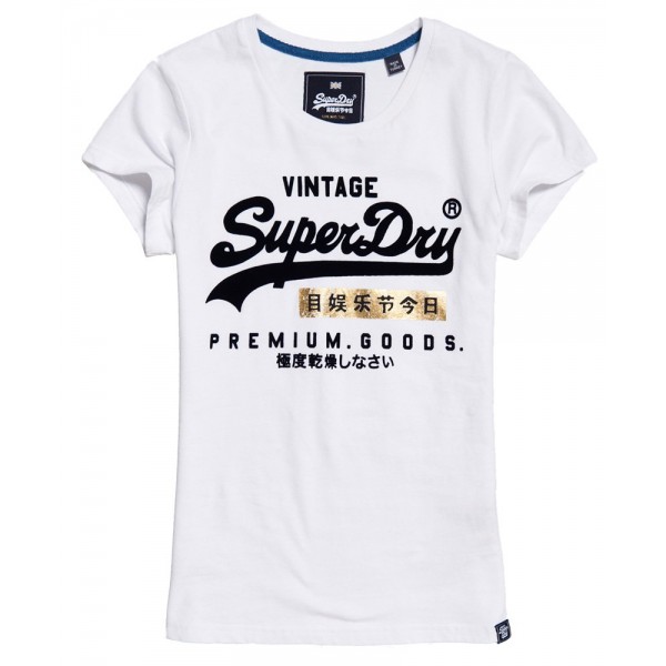 Superdry women’s Premium Goods Sport t-shirt. This soft-touch t-shirt features a flock version of the classic Vintage Superdry logo print across the chest and is finished with a logo tab on the hem